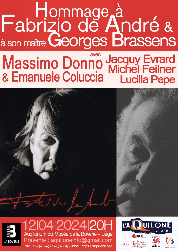 Lucilla Pepe participe à la soiré en hommage à Fabrizio De André et George Brassens, le vendredi 12 avril 2024 à 20h à l’auditorium du Musée de la Boverie à Liège. Elle sera accompagnée à la guitare par Salvatore Lombardo. Plus d’infos et prévente: