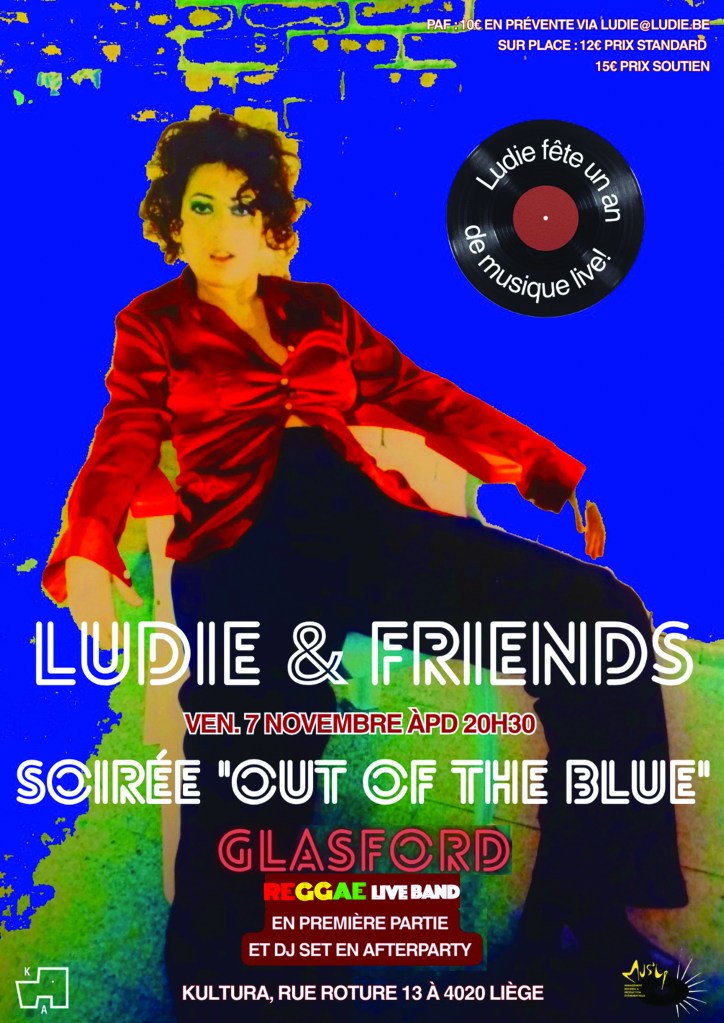 – 14 juin à L’Aquilone asbl àpd 20h : Showcase de LUDIE live band à ‘occasion de la sortie de l’EP « Out of the Blue ». Ludi présentera les morceaux originaux de l’album, Leaves, Rainy days et 1000 faces, ainsi que d’autres sons de prochaine sortie. La cover de l’EP est une peinture originale de l’artiste belge Lawrence.